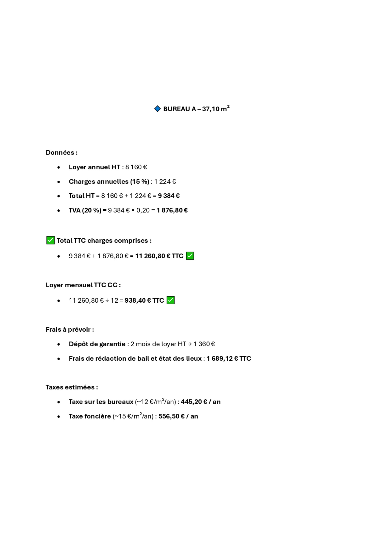 Bureau A – 37,10 m² : 938,40 € / mois TTC charges comprises
