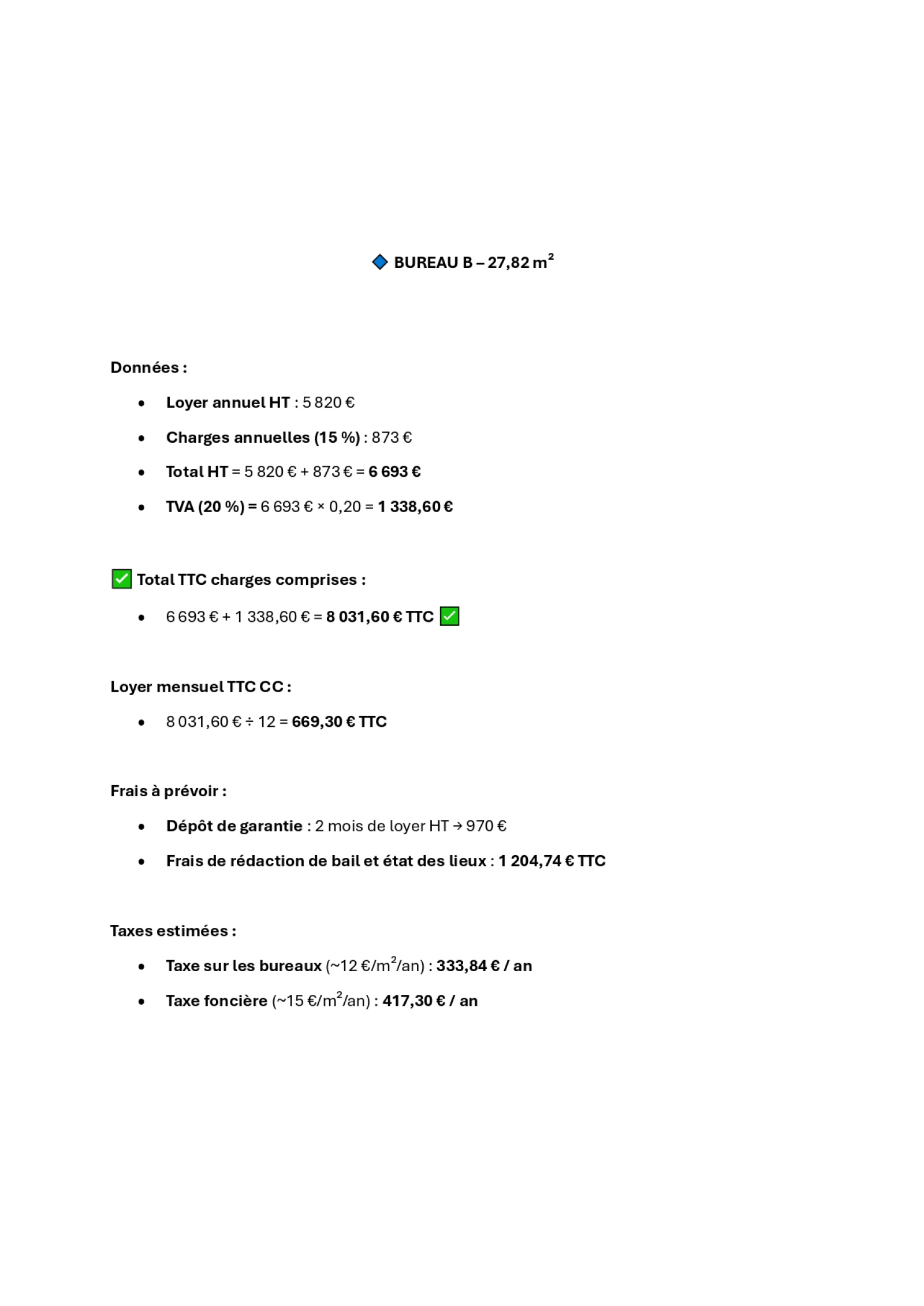 Bureau B – 27,82 m² : 669,30 € / mois TTC charges comprises