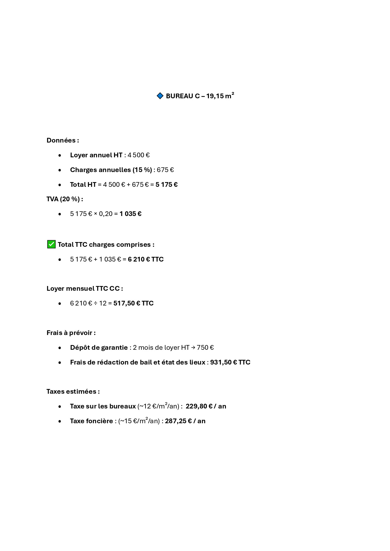 Bureau C – 19,15 m² : 517,50 € / mois TTC charges comprises