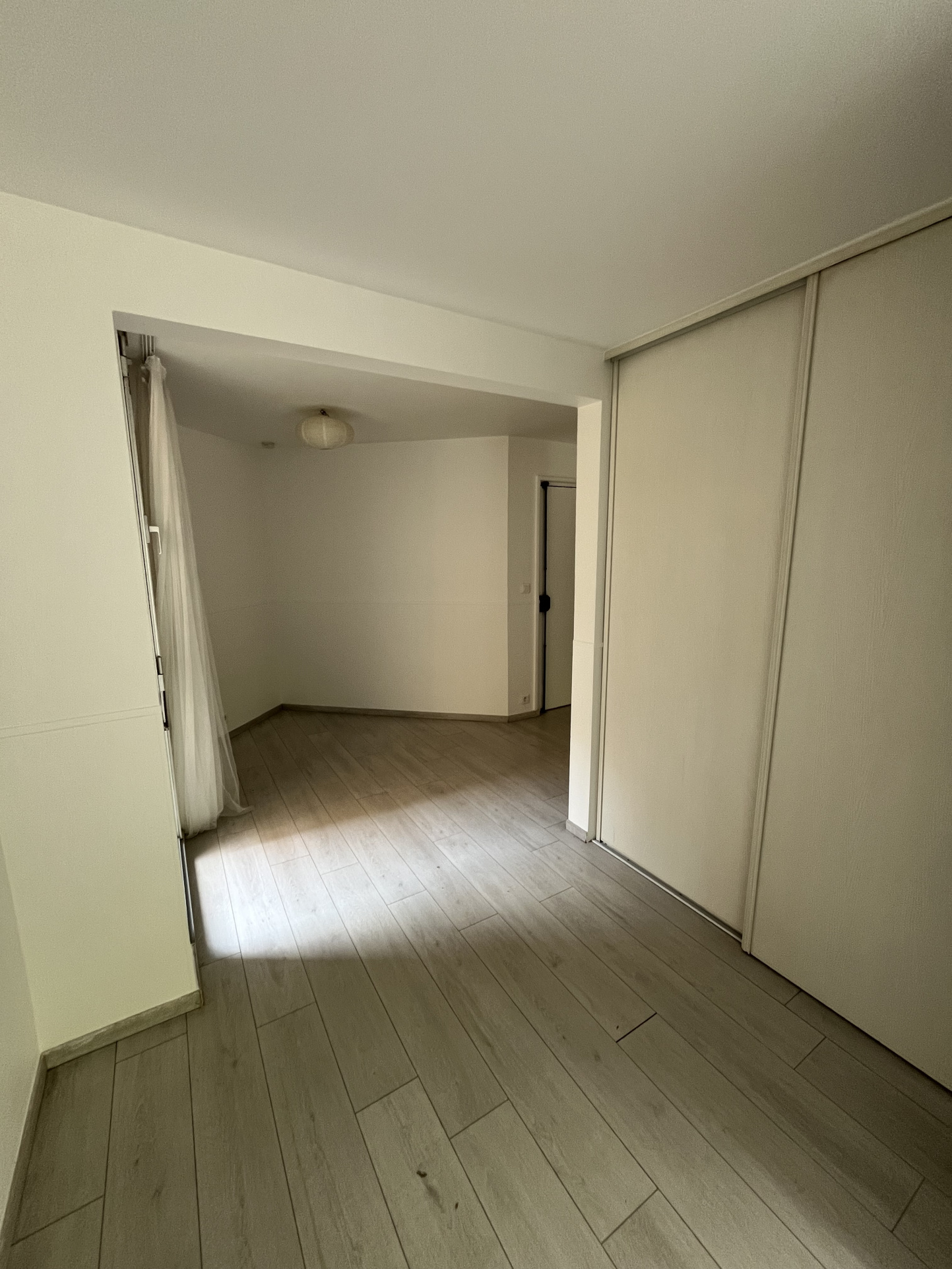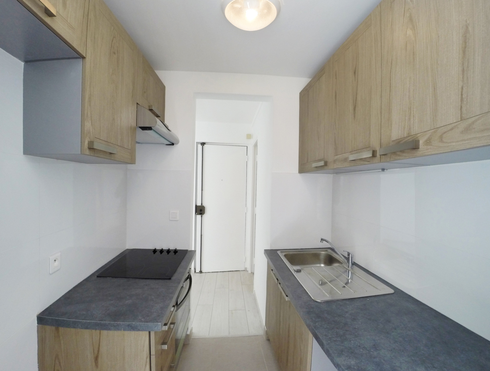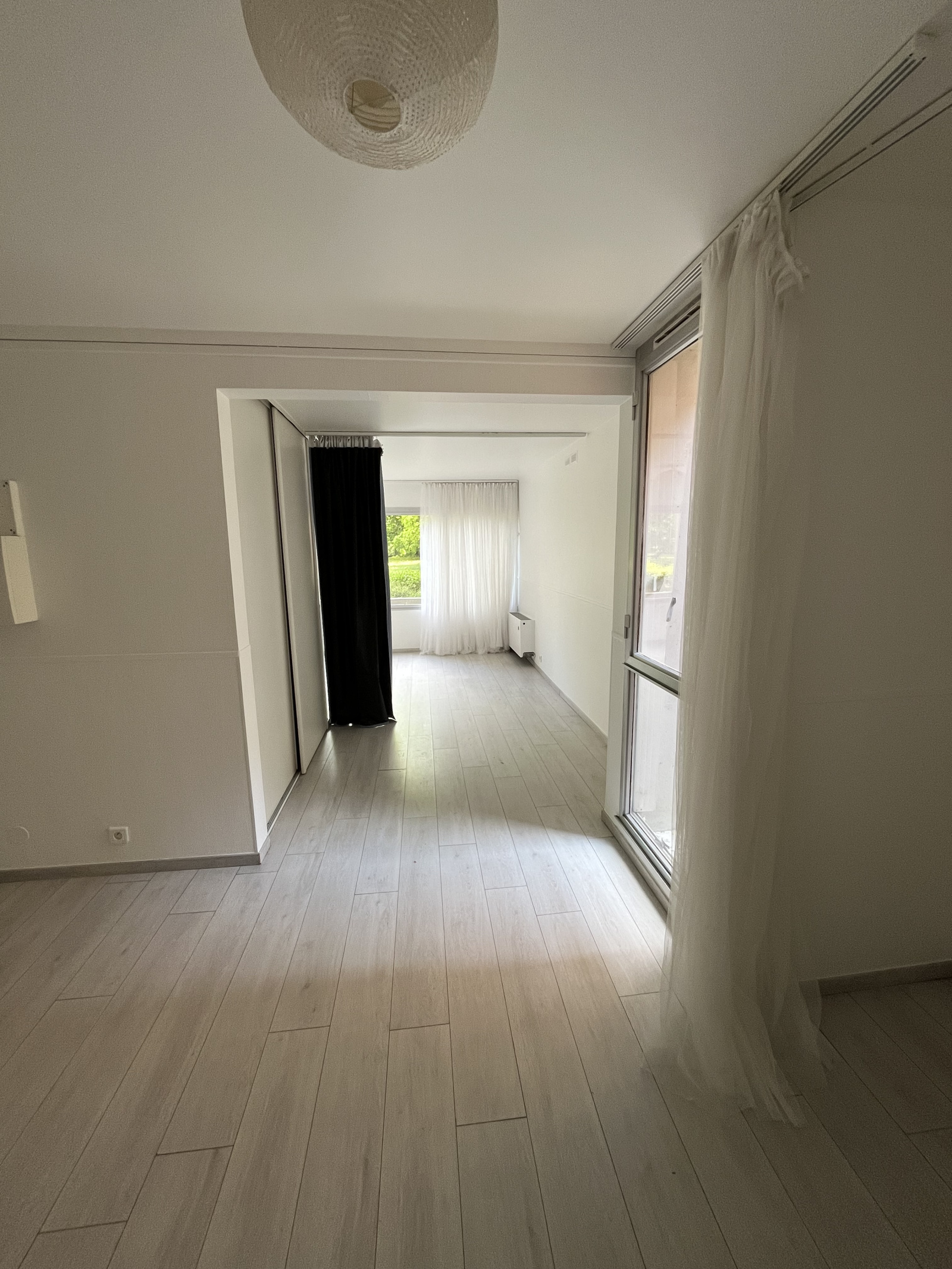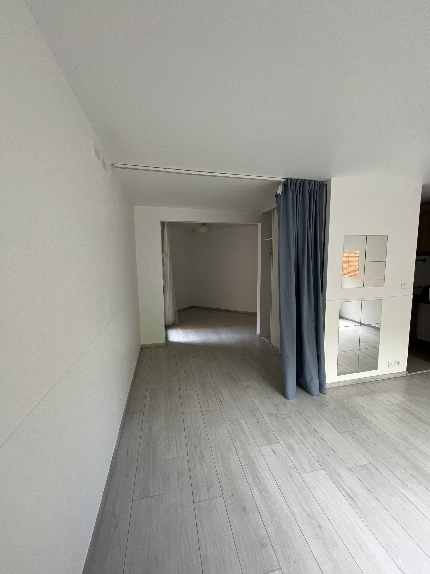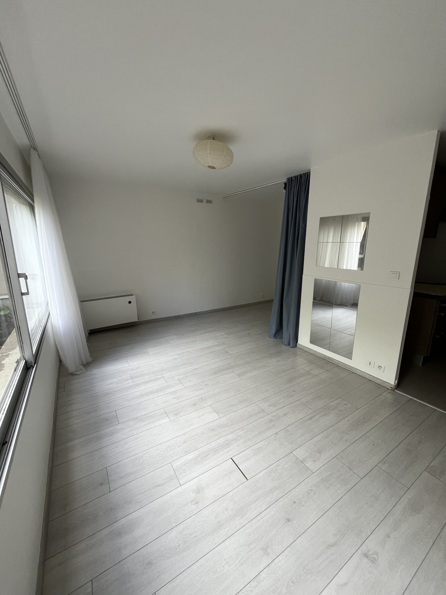 Un studio en rez-de-chaussée comprenant une grande pièce à vivre avec placards, une cuisine aménagée et partiellement équipée, une pièce d'eau avec WC.