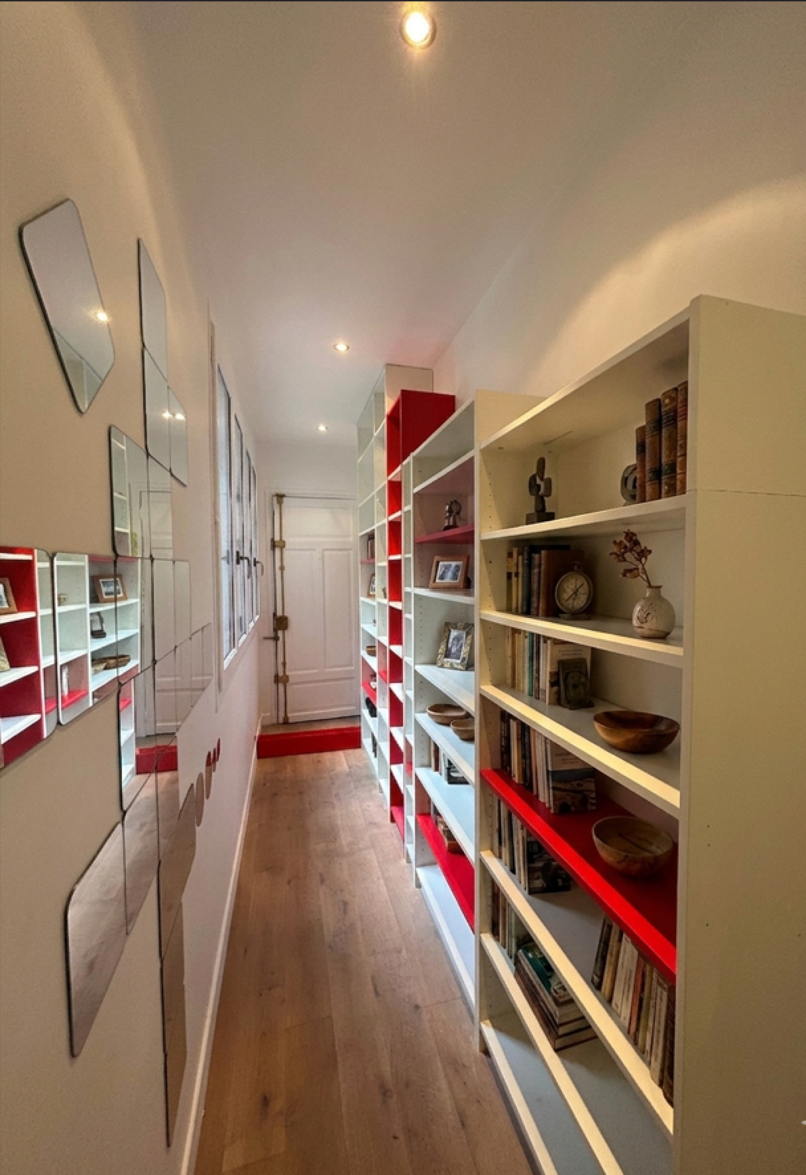 - L'entrée : Un couloir de 6 m² ingénieusement aménagé avec une bibliothèque intégrée et des espaces de rangement.