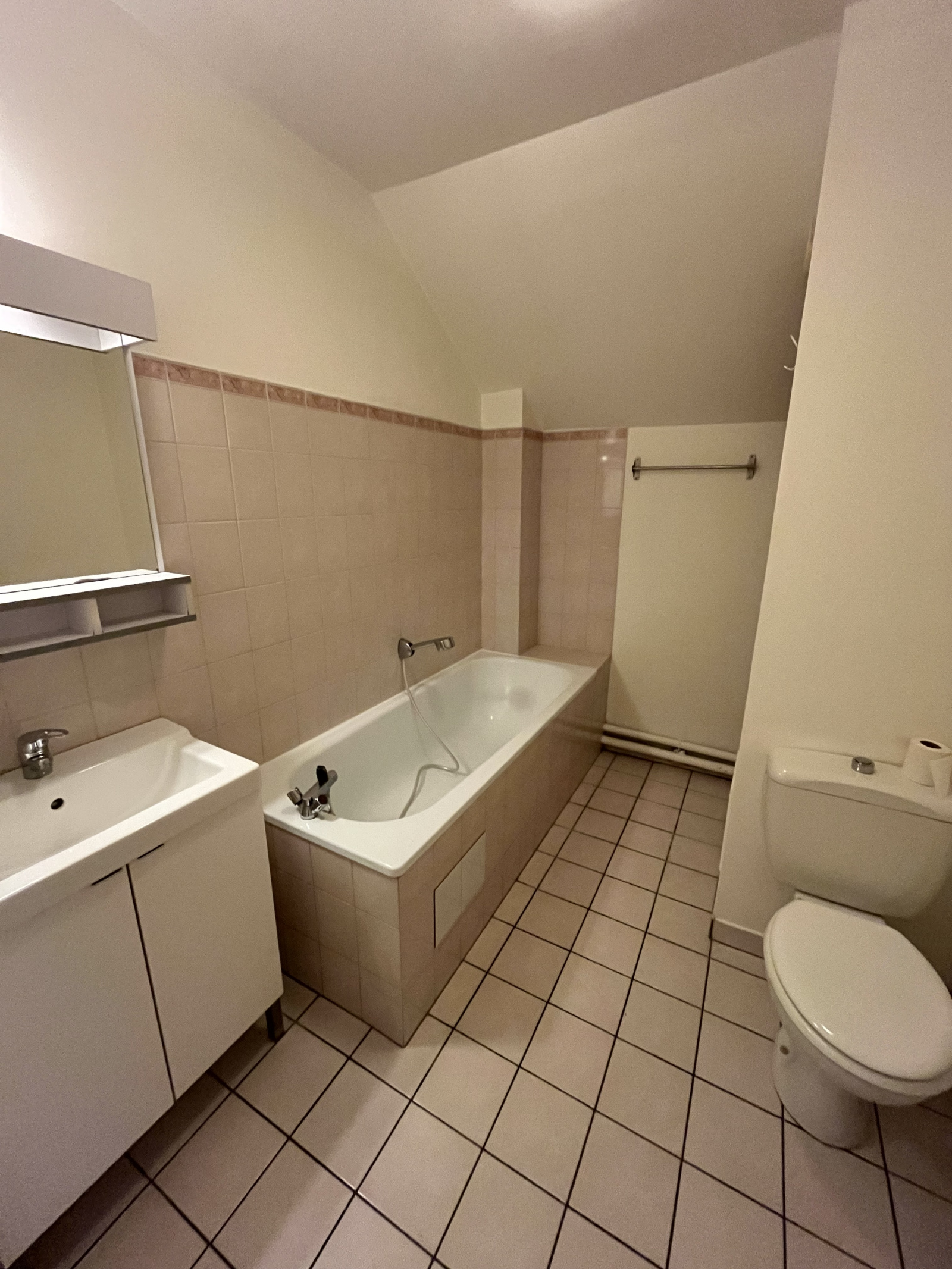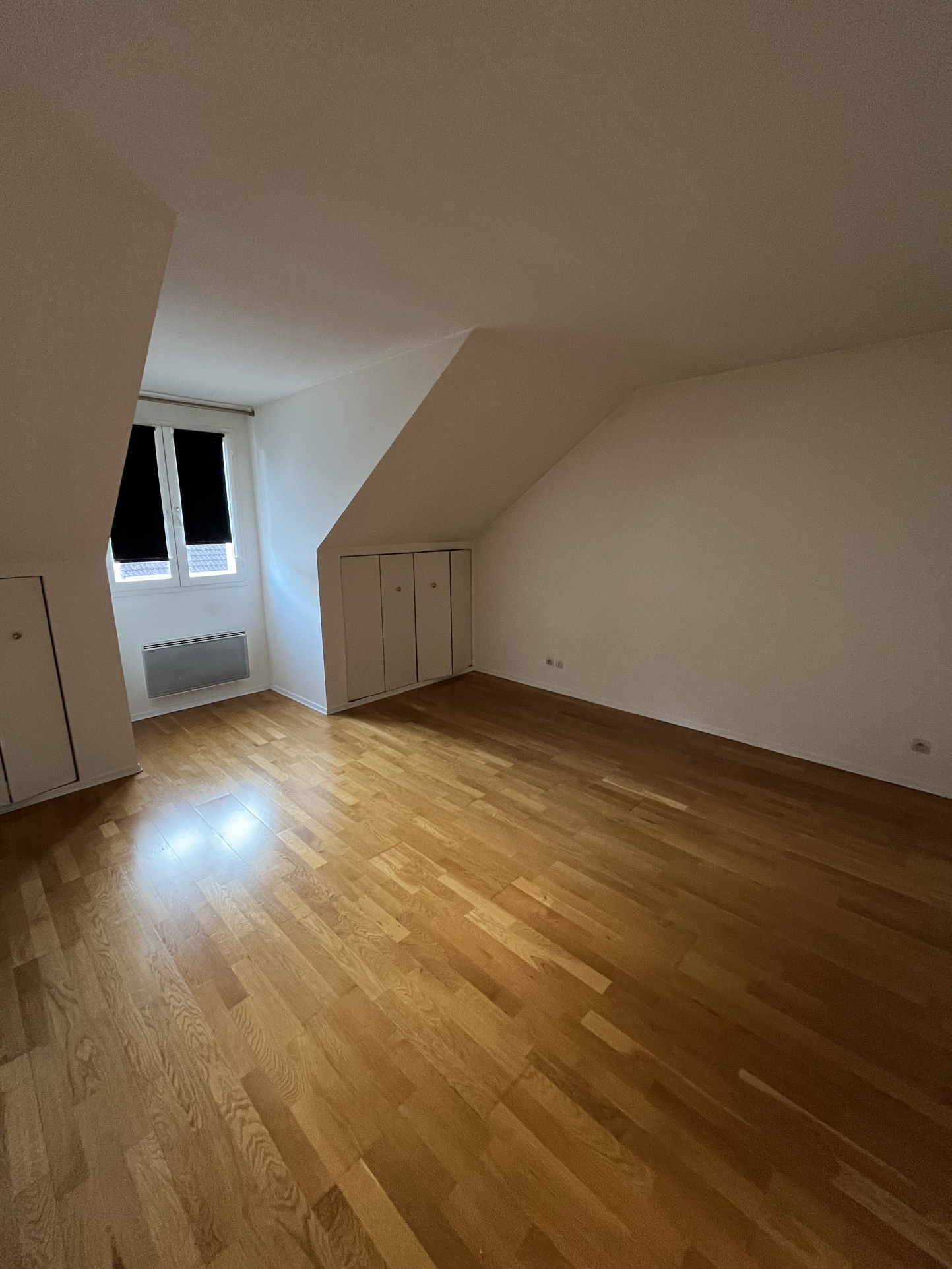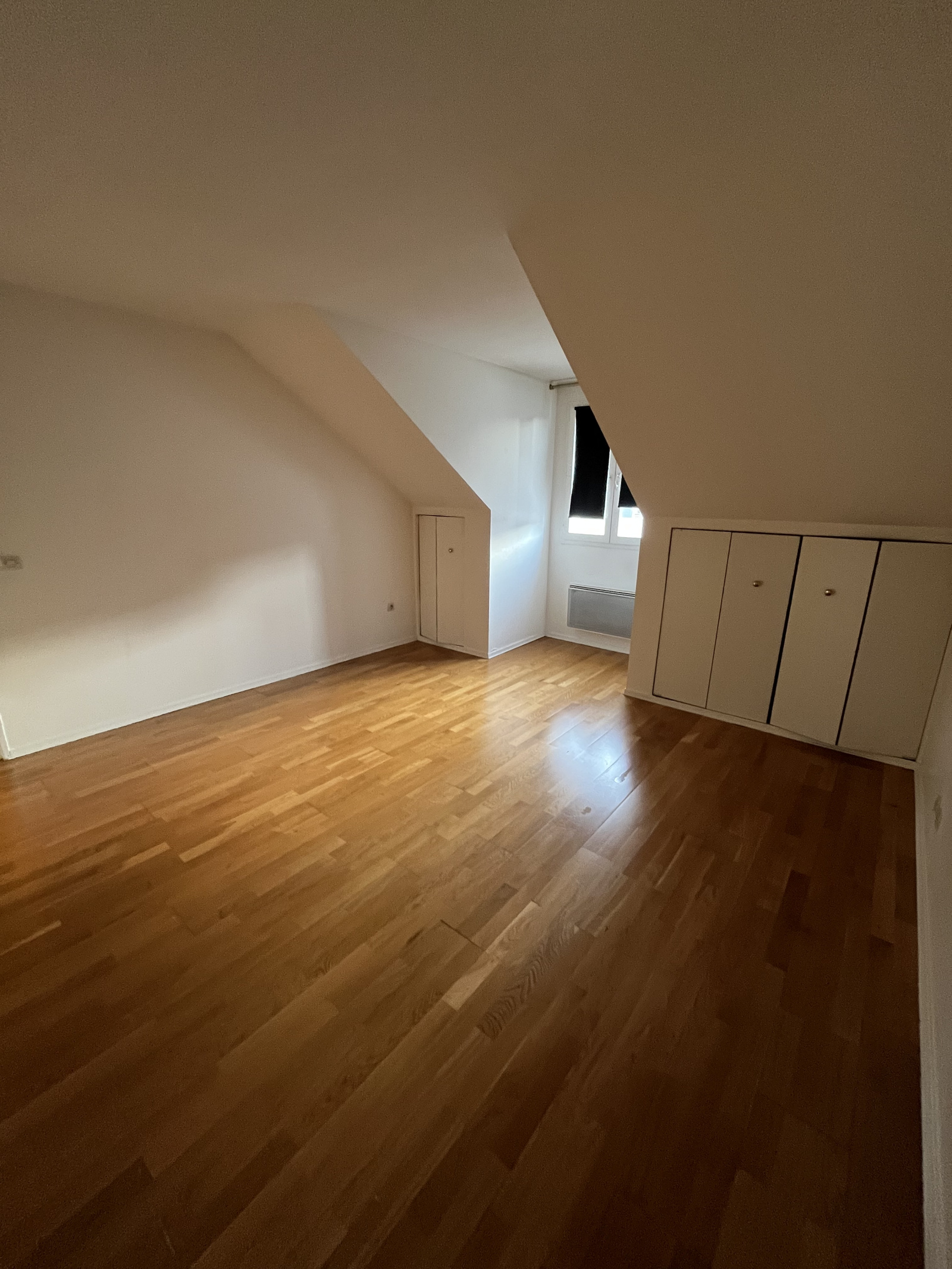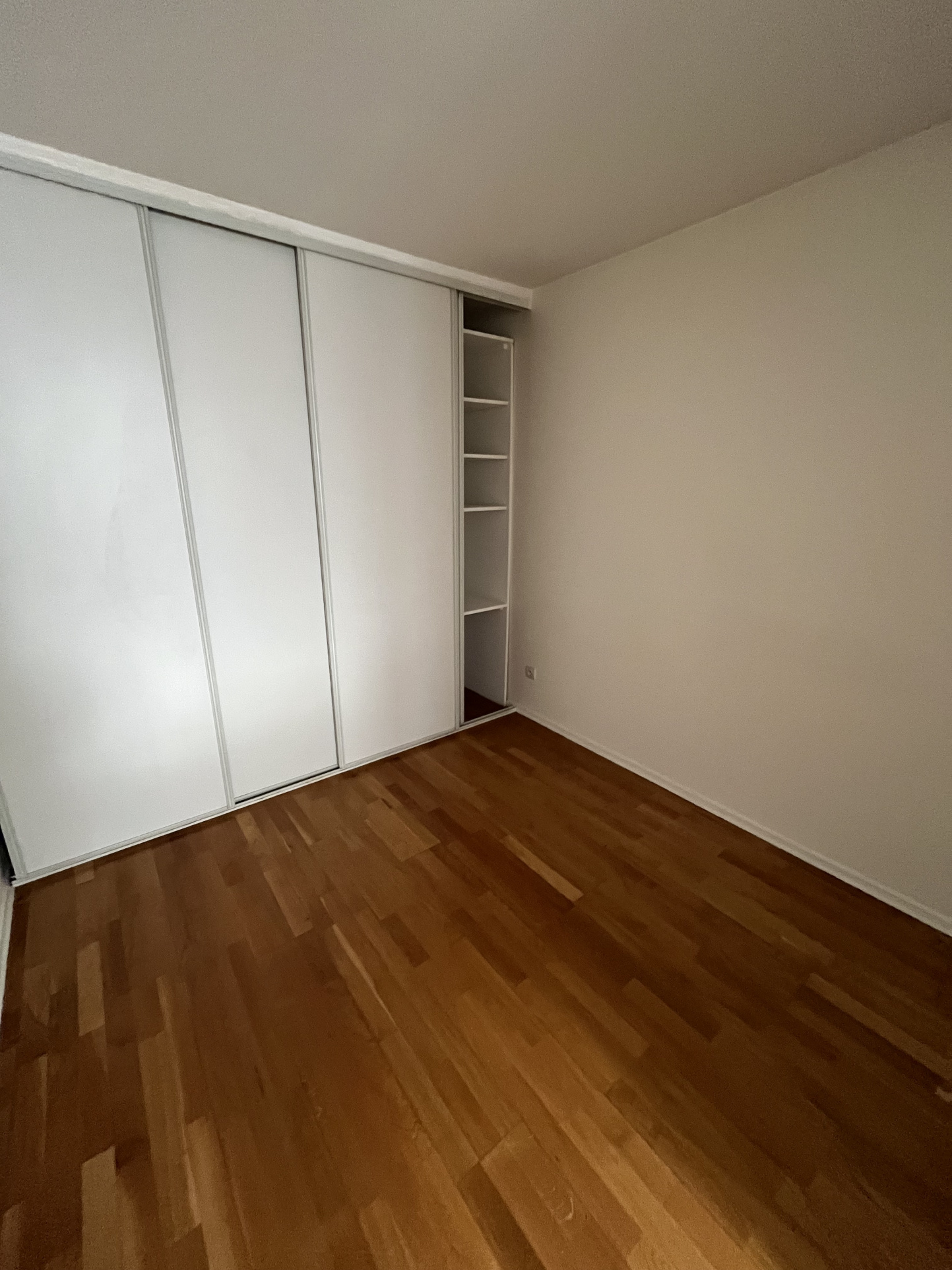 Deux belles chambres de plus de 12 m² avec placards intégrés, une salle de bains avec WC.